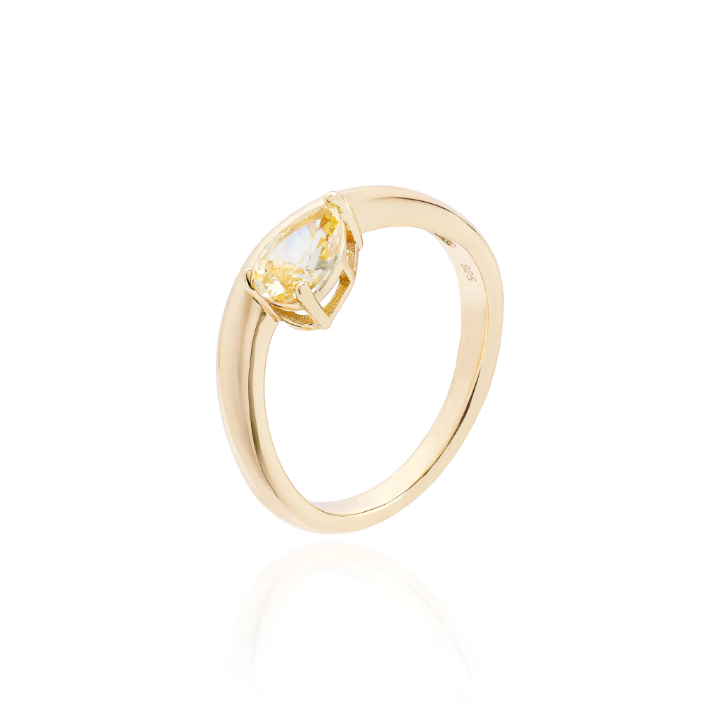 Este anel solitário é confeccionado em prata 925 com banho de ouro, com pedra em formato de gota deitada na cor yellow fancy, que proporciona um brilho sutil e elegante. O aro liso e minimalista valoriza a pedra, tornando a peça ideal para uso diário ou para compor mix com outros anéis finos.