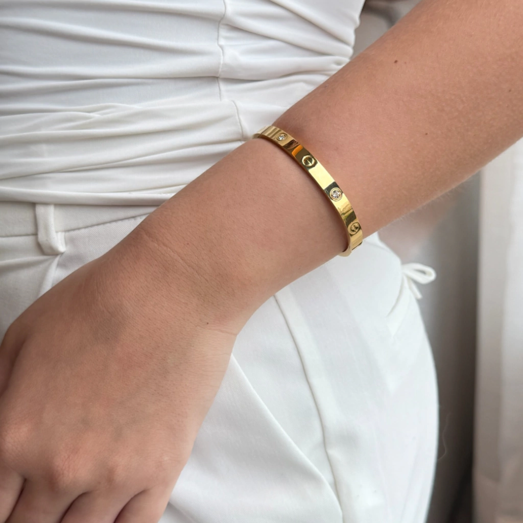 A Pulseira LOVE é banhada em ouro e apresenta um design clássico com detalhes em zircônia que acrescentam um toque de brilho sutil. Seu acabamento polido e estrutura firme proporcionam um visual contemporâneo e refinado, ideal para o dia a dia ou para composições mais elegantes.