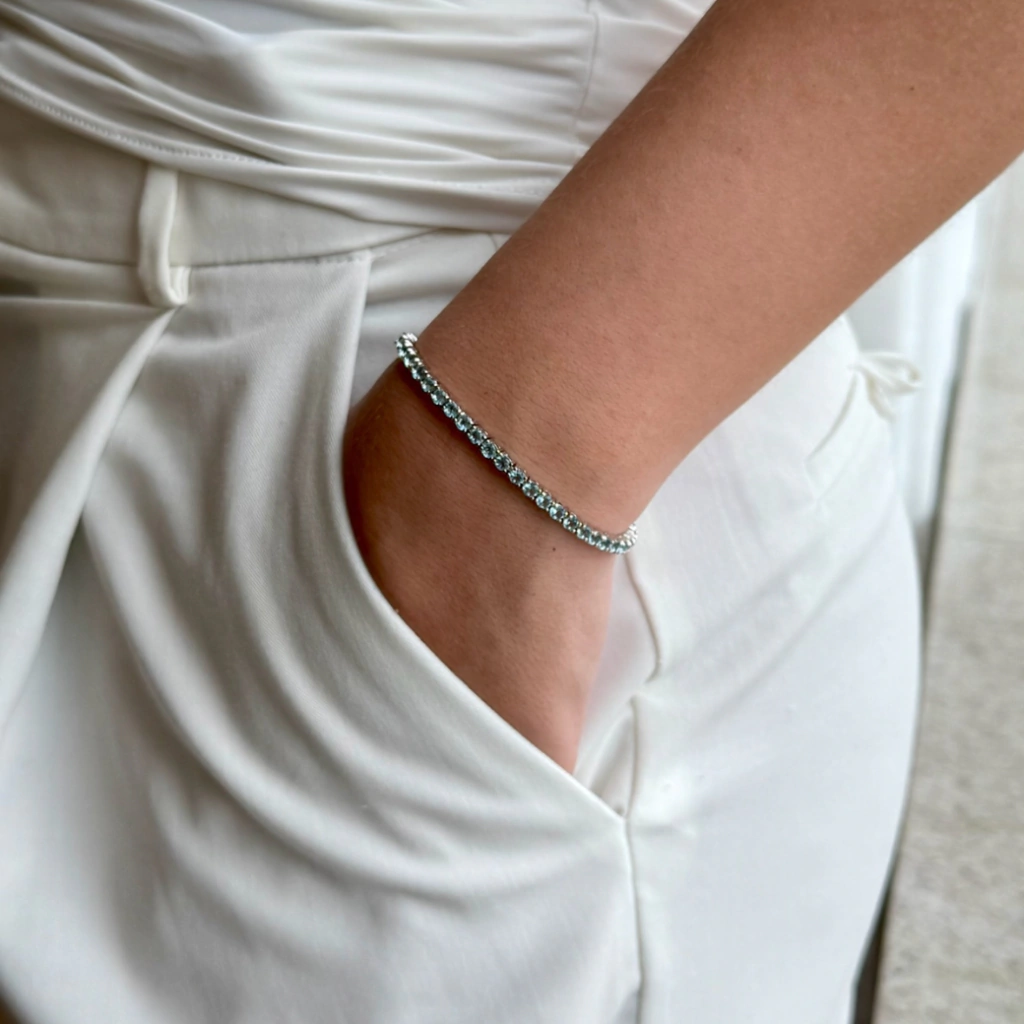 Seu design fino e minimalista torna essa riviera uma peça extremamente versátil, perfeita para ser usada sozinha, como ponto de destaque discreto, ou combinada com outras joias para composições mais elaboradas. O banho de ródio garante um acabamento luxuoso e duradouro, enquanto o tom acqua marine transmite leveza e modernidade, ideal para quem busca elegância em cada detalhe.