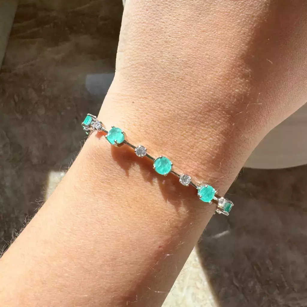 Combine com outras pulseiras finas ou braceletes rígidos para um mix sofisticado. A Turmalina Paraíba traz frescor ao look, sendo perfeita tanto para o dia quanto para eventos noturnos. Fica linda com roupas claras, alfaiataria ou tecidos fluídos em tons neutros.